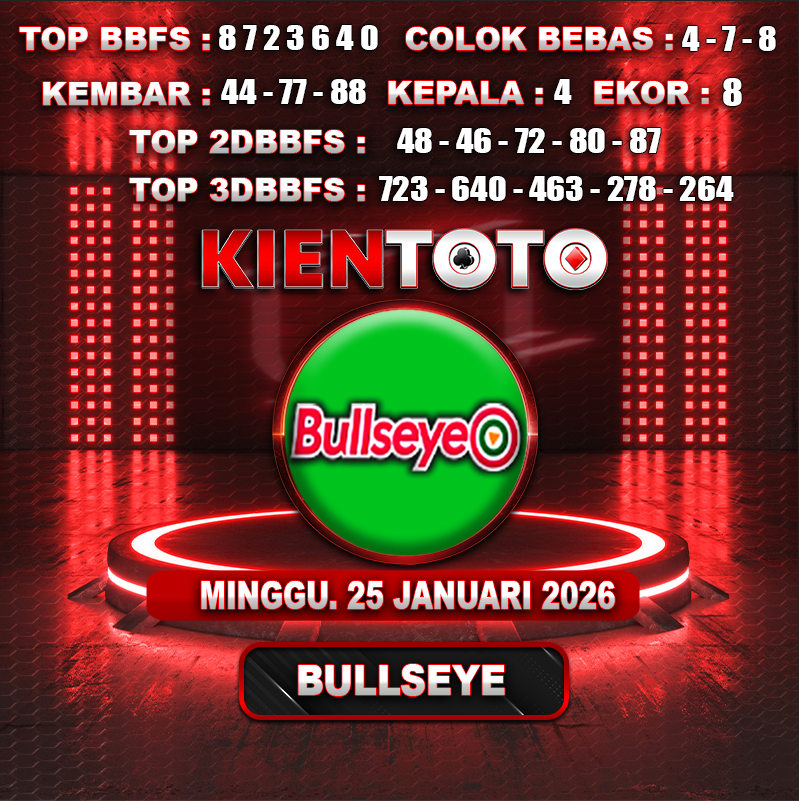PREDIKSI TOGEL BULLSEYE 25 JANUARI 2026 Selamat Datang dan Selamat Bergabung di Situs Prediksi Togel Online. Permainan Togel Online saat ini telah menarik banyak perhatian para bettor di Indonesia. Jika dulunya Anda harus menikmati permainan togel melalui bandar togel darat, maka sekarang ini Anda hanya perlu mempercayakan KIENTOTO sebagai Bandar Togel Online Resmi dan Terpercaya. Melihat semakin tingginya minat para pecinta togel online, kami menyediakan Situs Prediksi Togel Online dan Bocoran Togel Jitu yang bisa Anda jadikan sebagai acuan sebelum melakukan pemasangan angka togel.