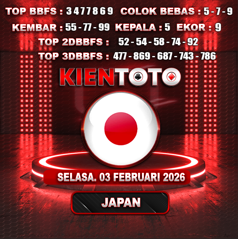 PREDIKSI TOGEL JAPAN 03 EBRUARI 2026 Selamat Datang dan Selamat Bergabung di Situs Prediksi Togel Online. Permainan Togel Online saat ini telah menarik banyak perhatian para bettor di Indonesia. Jika dulunya Anda harus menikmati permainan togel melalui bandar togel darat, maka sekarang ini Anda hanya perlu mempercayakan KIENTOTO sebagai Bandar Togel Online Resmi dan Terpercaya. Melihat semakin tingginya minat para pecinta togel online, kami menyediakan Situs Prediksi Togel Online dan Bocoran Togel Jitu yang bisa Anda jadikan sebagai acuan sebelum melakukan pemasangan angka togel.