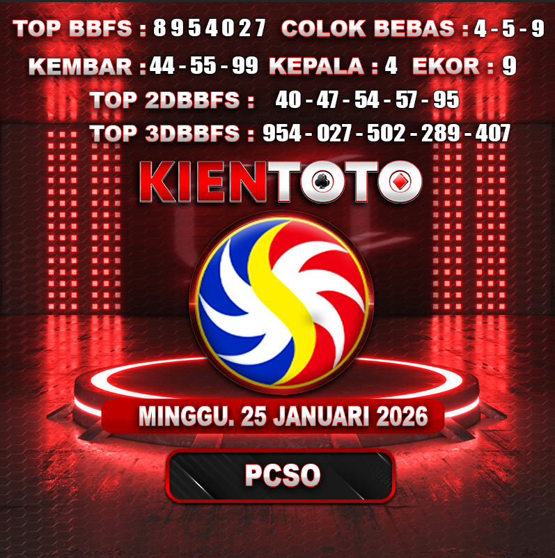 PREDIKSI TOGEL PCSO 25 JANUARI 2026 Selamat Datang dan Selamat Bergabung di Situs Prediksi Togel Online. Permainan Togel Online saat ini telah menarik banyak perhatian para bettor di Indonesia. Jika dulunya Anda harus menikmati permainan togel melalui bandar togel darat, maka sekarang ini Anda hanya perlu mempercayakan KIENTOTO sebagai Bandar Togel Online Resmi dan Terpercaya. Melihat semakin tingginya minat para pecinta togel online, kami menyediakan Situs Prediksi Togel Online dan Bocoran Togel Jitu yang bisa Anda jadikan sebagai acuan sebelum melakukan pemasangan angka togel.
