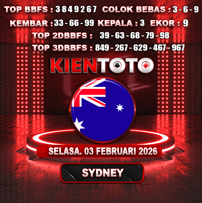 PREDIKSI TOGEL SYDNEY 03 FEBRUARI 2026 Selamat Datang dan Selamat Bergabung di Situs Prediksi Togel Online. Permainan Togel Online saat ini telah menarik banyak perhatian para bettor di Indonesia. Jika dulunya Anda harus menikmati permainan togel melalui bandar togel darat, maka sekarang ini Anda hanya perlu mempercayakan KIENTOTO sebagai Bandar Togel Online Resmi dan Terpercaya. Melihat semakin tingginya minat para pecinta togel online, kami menyediakan Situs Prediksi Togel Online dan Bocoran Togel Jitu yang bisa Anda jadikan sebagai acuan sebelum melakukan pemasangan angka togel.